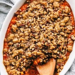 The best sweet potato casserole is smooth and creamy, sprinkled with a brown sugar pecan mixture. It’s a sweet and savory side dish that is perfect for the holidays!