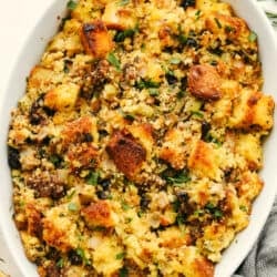 Cornbread stuffing is a delicious hearty dish that your family will go crazy over this Thanksgiving! It’s loaded with fresh herbs, fruits, and veggies for the perfect sweet and savory side.
