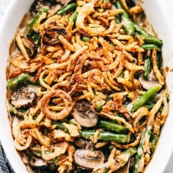 Green bean casserole uses fresh mushrooms salted with onions and garlic, topped with crispy onions, and loaded with fresh, crunchy green beans! This might be your favorite dish next Thanksgiving!