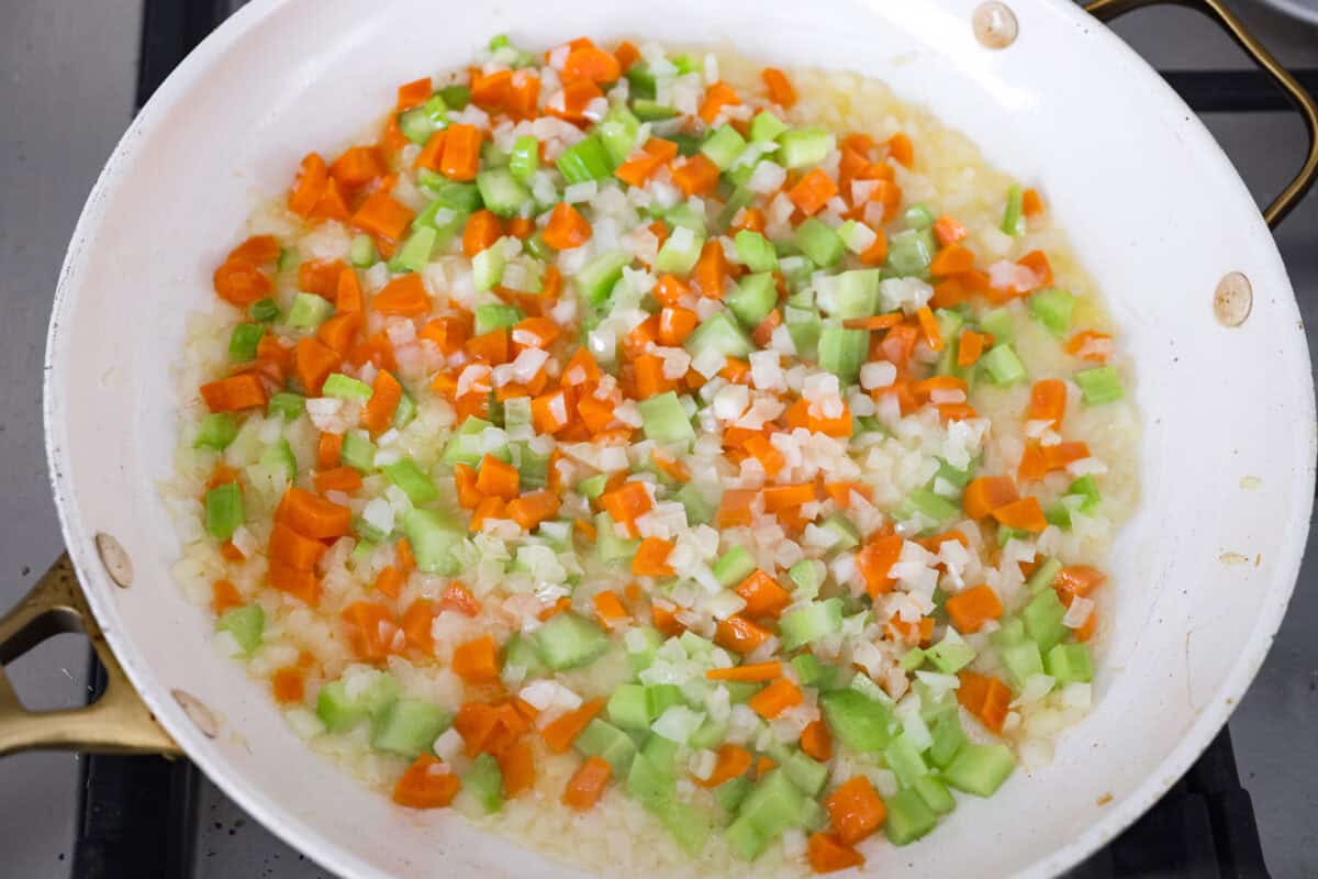 • In a large skillet melt the ¼ cup unsalted butter over medium-high heat. Add the 1 cup minced yellow onion, 2 ribs chopped celery, and 2 peeled and chopped carrots to the pan and cook, stirring frequently, until the vegetables are tender. About 3-5 minutes.