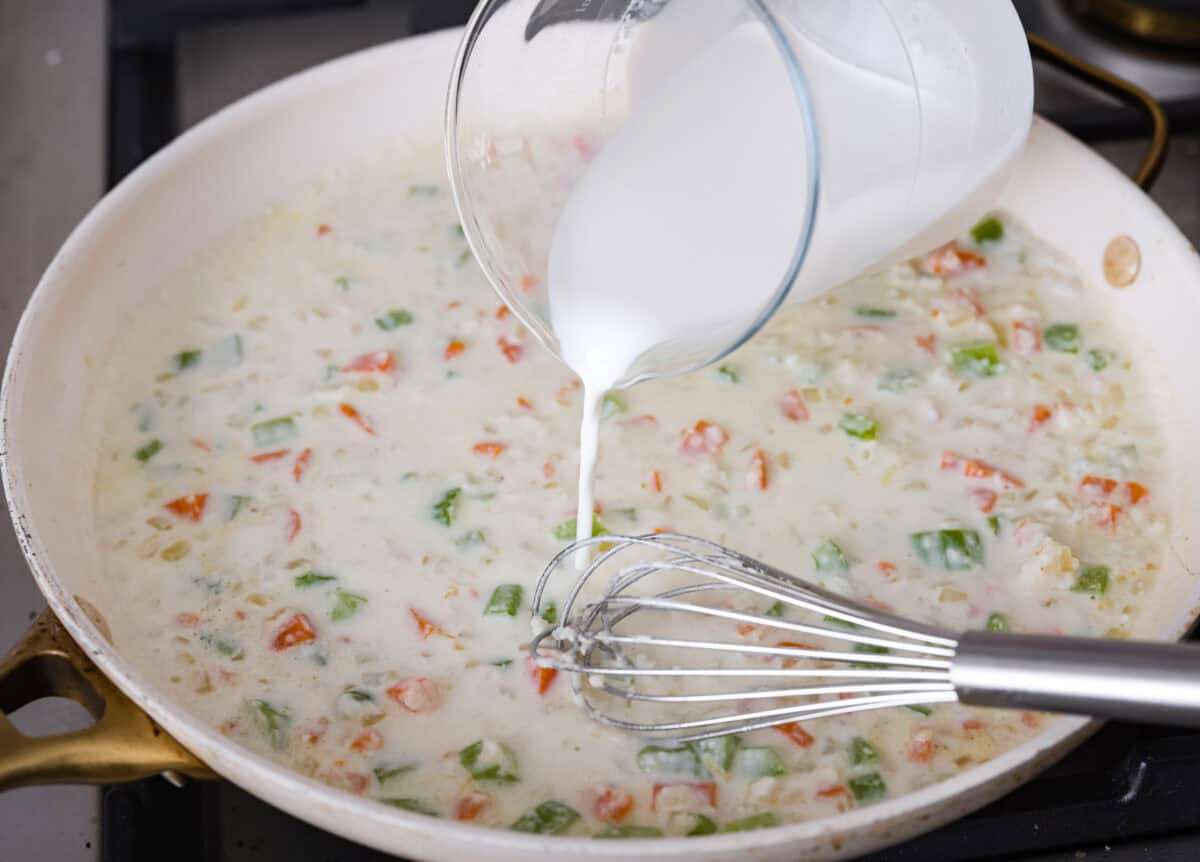 2. Make the Sauce: Whisk the all-purpose flour into the vegetable mixture. Then, slowly whisk in the chicken broth and half and half. A gravy should form as you whisk in the liquid.