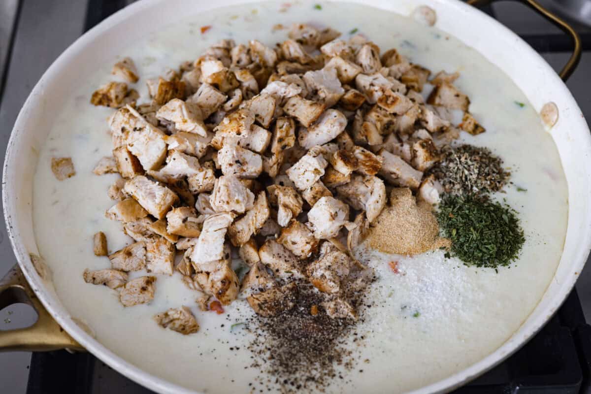 3. Add: Stir in the cooked and chopped shredded chicken, garlic powder, dried parsley, dried basil, and salt and pepper to taste.