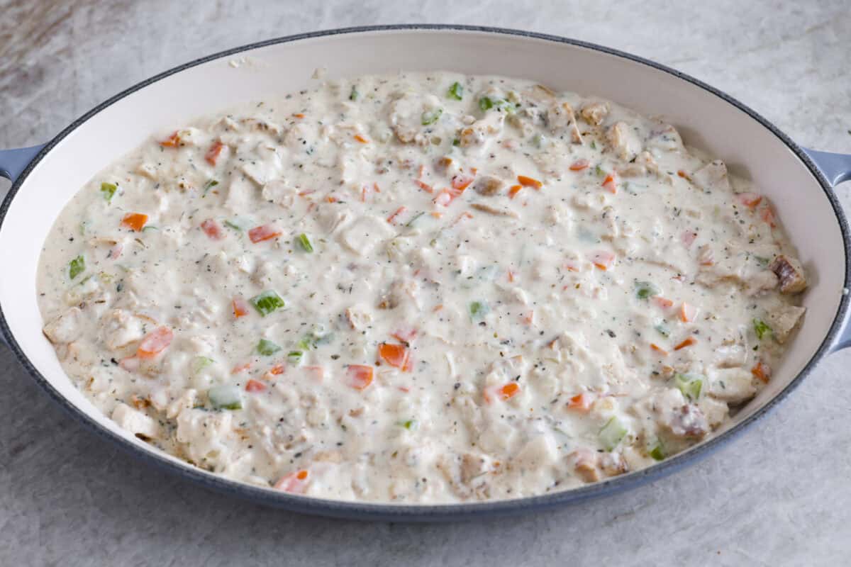 • Pour the ¾ cup + 2 tablespoons whole milk into the mixture to bring the dough together. Drop spoonfuls of the dumpling dough evenly across the top of the chicken and vegetables.