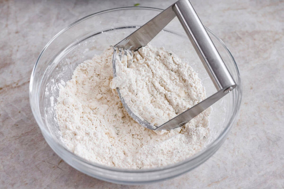 • In a bowl, whisk together the 1 ½ cups all-purpose flour, 1 ½ teaspoons baking powder, 1 ½ teaspoons salt, and 1 ½ teaspoons dried parsley. Using a pastry blender or fork, cut the ¼ cup cold, cubed unsalted butter into the flour mixture until it’s evenly distributed.