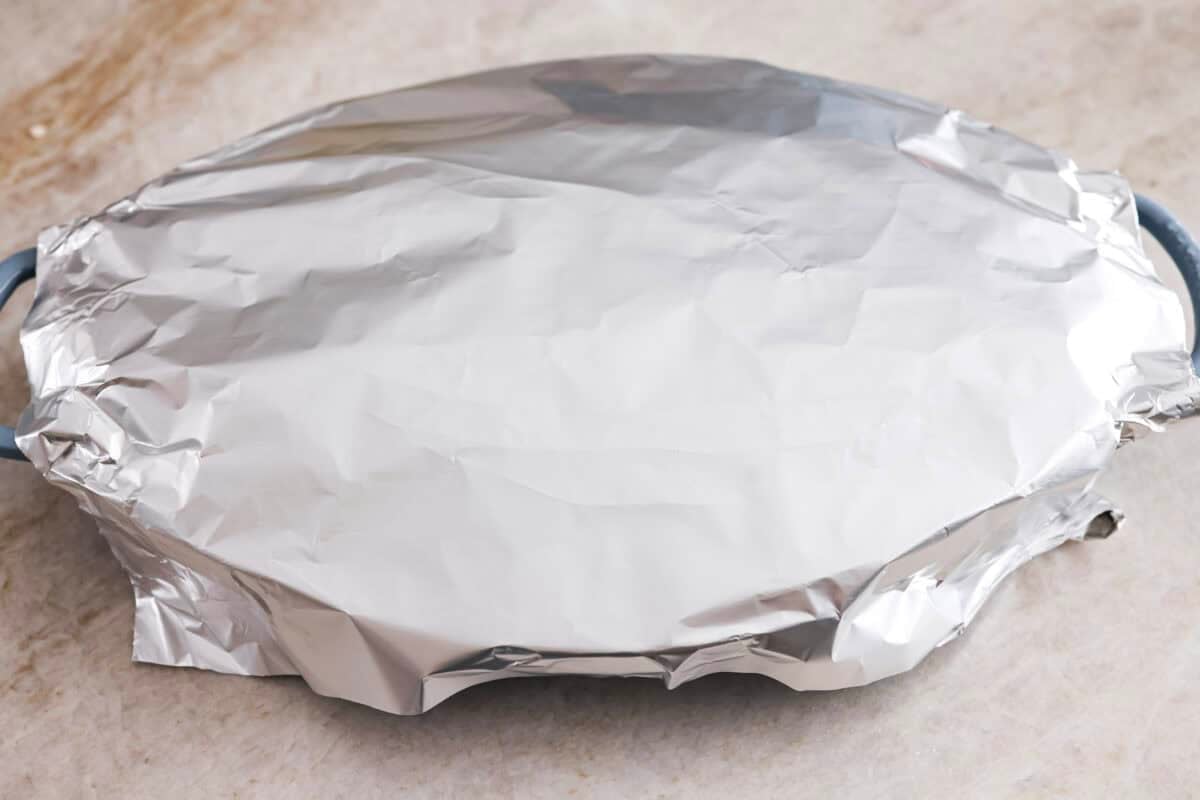 • Loosely cover the dish with foil, making sure it doesn’t touch the dumplings, and bake for 30 minutes. Uncover the dish and bake for another 10-15 minutes until the dumplings are lightly browned on top.