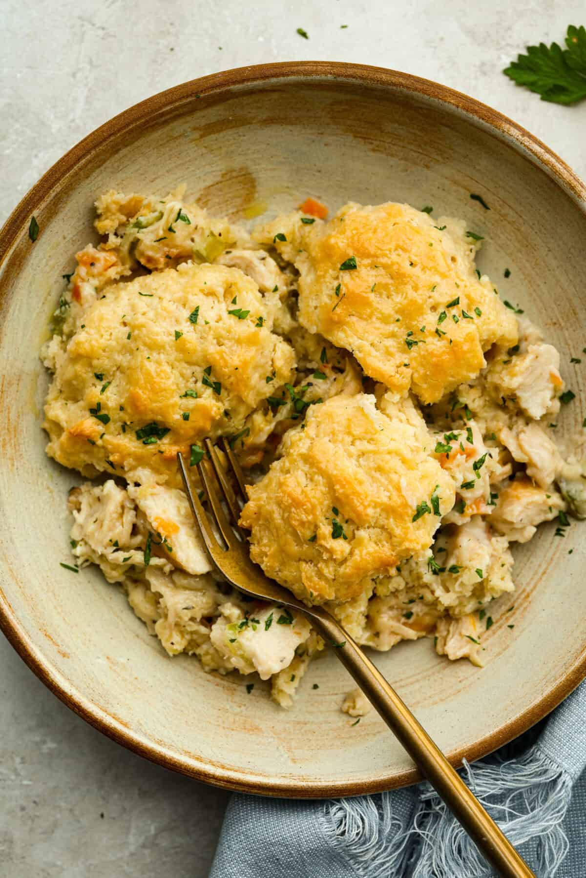 • Make Ahead: Assemble the chicken and vegetables and cover the dish. Keep in the fridge for up to 4 days before making the dumplings, topping the casserole, and baking.