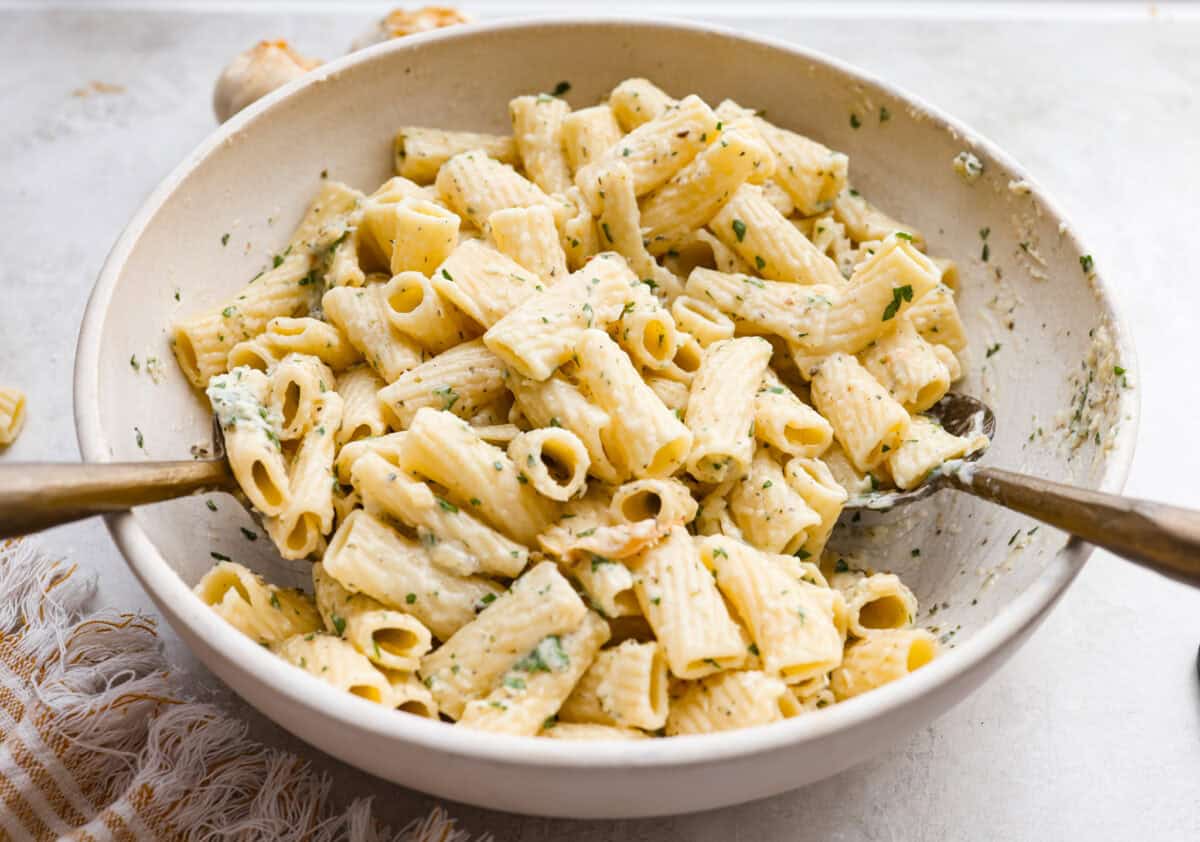 Serving bowl full or garlic bread pasta.