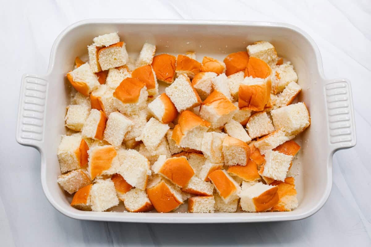 - Slice the Rolls: Preheat the oven to 375ºF and spray a 9 x 13-inch baking dish with nonstick cooking spray. Dice the Hawaiian rolls into 1-inch cubes and add to the prepared baking dish.