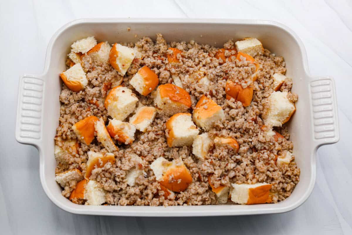 - Add Sausage: Cook the breakfast sausage in a large skillet over medium heat. Break it up as it cooks until no pink remains, about 5-8 minutes. Spread the cooked sausage over the top of the diced rolls.