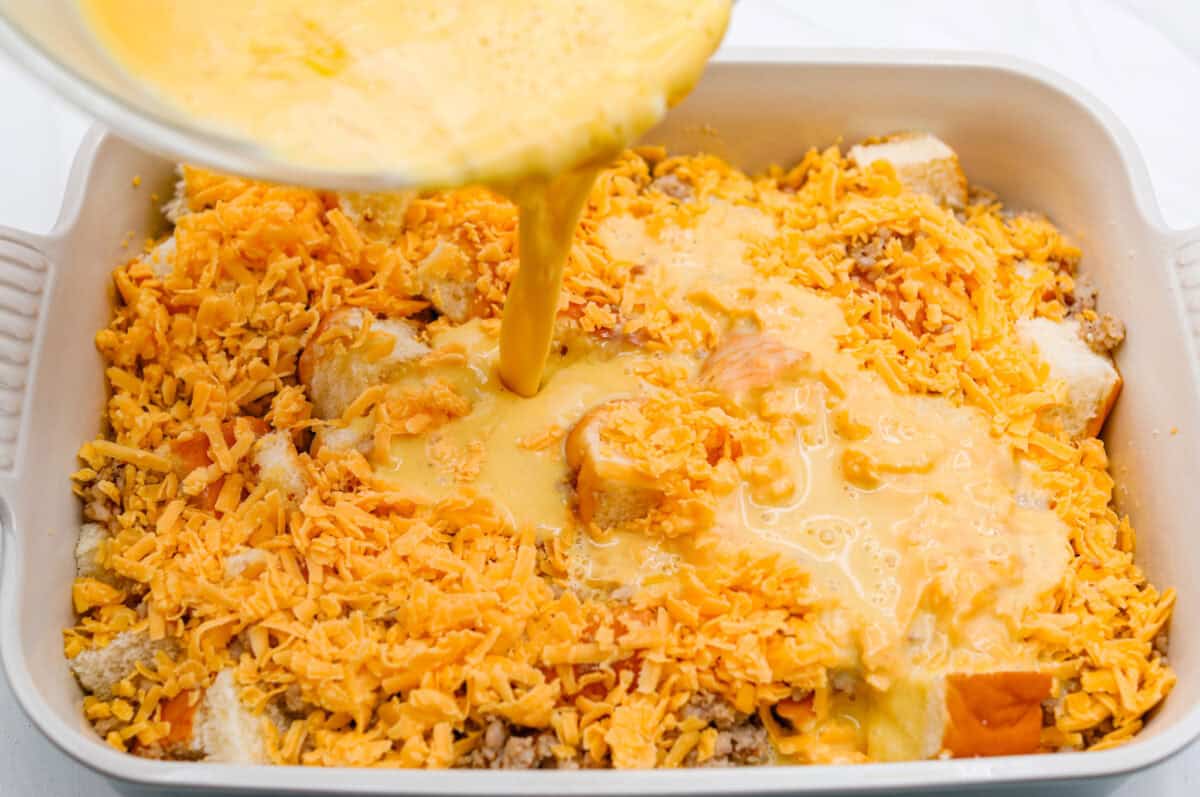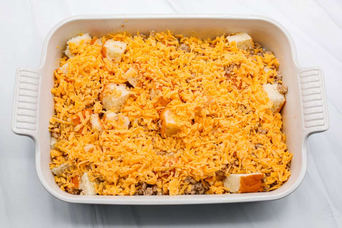 Spread the cooked sausage over the diced rolls. Spread 2 cups shredded cheddar cheese evenly over the top of the sausage.