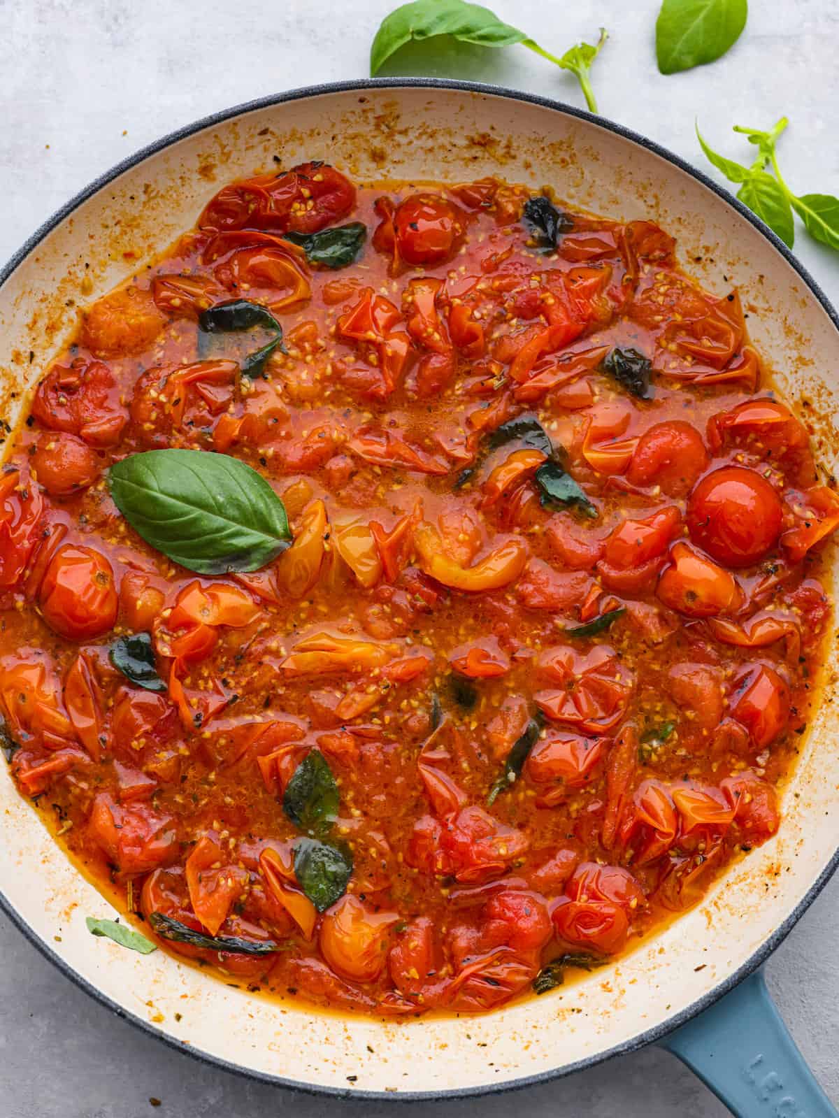 - Blend: Use an immersion blender or mash any large chunks of tomato to reach the desired sauce consistency. Season with a pinch salt to taste, if needed, serve over pasta, and enjoy!