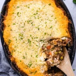 This easy Shepherd’s Pie recipe is made with a saucy ground beef base, vegetables and creamy mashed potatoes. It’s a hearty make-ahead meal for busy weeknights or Sunday dinner!