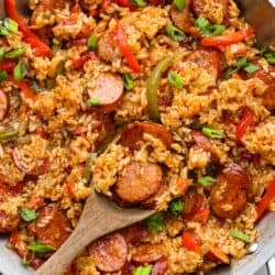 This delicious Cajun Rice and Sausage Skillet has become an instant favorite in our house! It’s easy to make in one pan with flavorful andouille sausage, veggies and rice with an incredible cajun seasoning blend. A complete meal on the table in just 30 minutes!